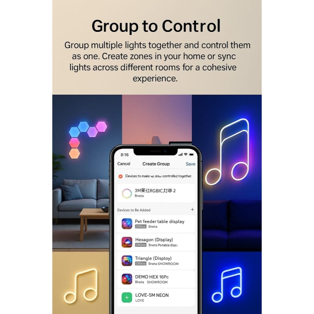 Group multiple lights together and control them as one. Create zones in your home or sync lights across different rooms for a cohesive experience.